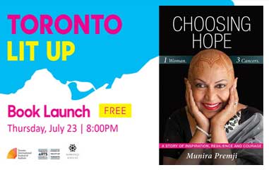July 23, 2020 @ 8:00 PM Free Events | Virtual Cost: FREE Munira Premji is releasing her memoir, Choosing Hope: One Woman. Three Cancers, and will be celebrating its publication with a Toronto Lit Up book launch! Join Mawenzi House and the Toronto International Festival of Authors for this exciting event. Choosing Hope: One...