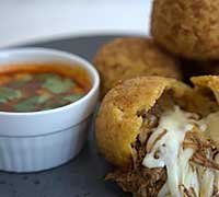 Famous Birria beef and cheese tacos are now bite-sized; stuffed into a corn tortilla ball and deep-fried golden brown and served with consommé.
