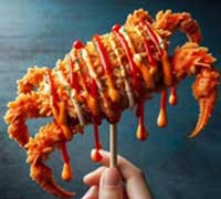 Crunchy, saucy, whole crab on a stick! Japanese-style soft-shell crab coated with potato starch deep-fried and covered in ketchup, mayonnaise, and hot sauce.