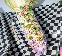 Take a bite of fire-roasted street corn coated with purple yam and sprinkled with cheese, sesame seeds, chilli flakes, and spring onions.