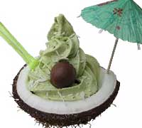 A tropical phenomenon of frozen dessert – avocado ice cream garnished with coconut shavings and a chocolate ball to reconstruct into the shape of an avocado and served in a coconut bowl.